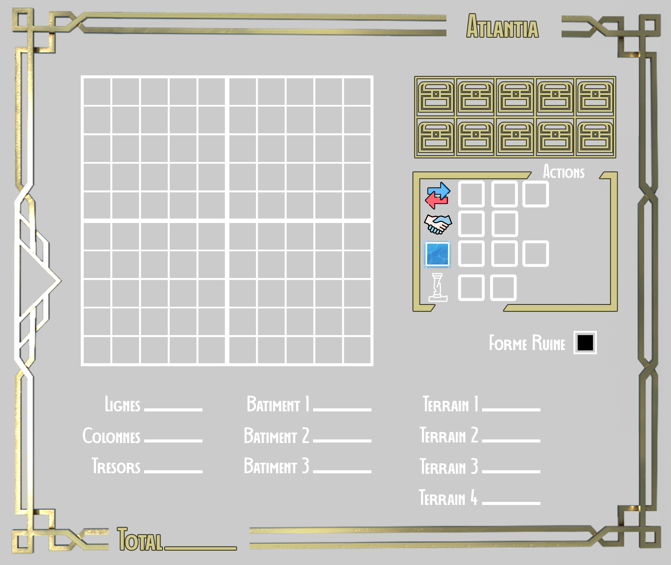 Les ruines des cités antiques regorgent d’histoire et de trésors. Vous êtes envoyés par de puissantes industries pour cartographier d’antiques cités. Dans ce jeu de «Flip and Write» vous choisirez chaque tour une des formes apparaissant sur votre sonar et la reportez sur votre carte. Vous n’êtes pas seul dans la région, d’autres équipes envoyées par des entreprises concurrentes sont présentes, n’hésitez pas à leur mettre des bâtons dans les roues.